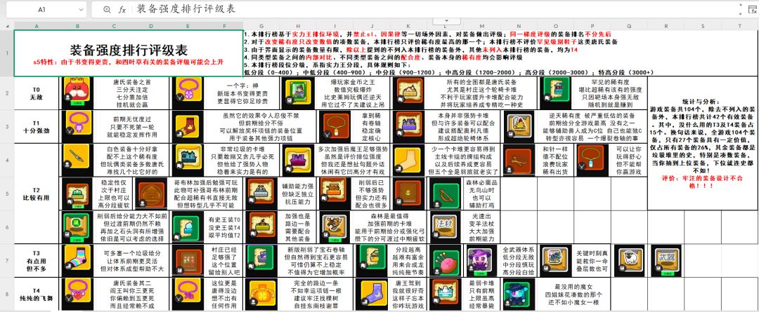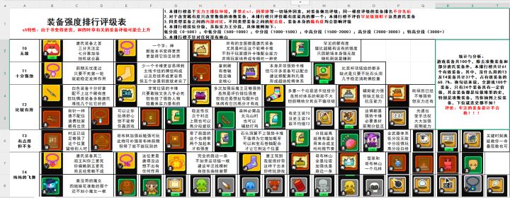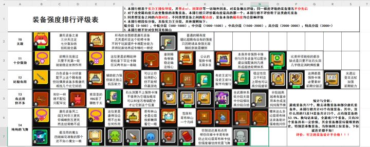 2025.04.27更新:详见第四张图,依据平衡性调整,调整了部分装备的评级,加入了最新装备;删除了部分装备,修改了分段的区间规则(详见右上角说明)
