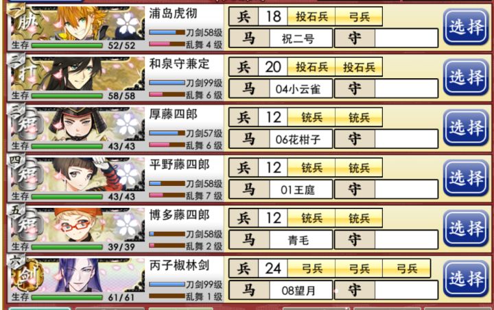 【兵装】极短带金铳,极胁带金弓(投石也行,弓伤害高,投石血条高,按自己的练度尝试),普打带金投石,丙子带金弓。