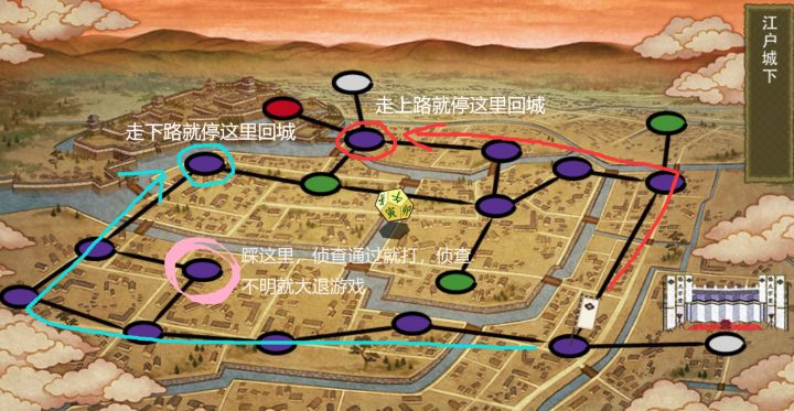 【注意点1】:走上路停在王点前回城(不踩王点,一共6个点),走下路停在资源点前回城(绿点前,7个点)。