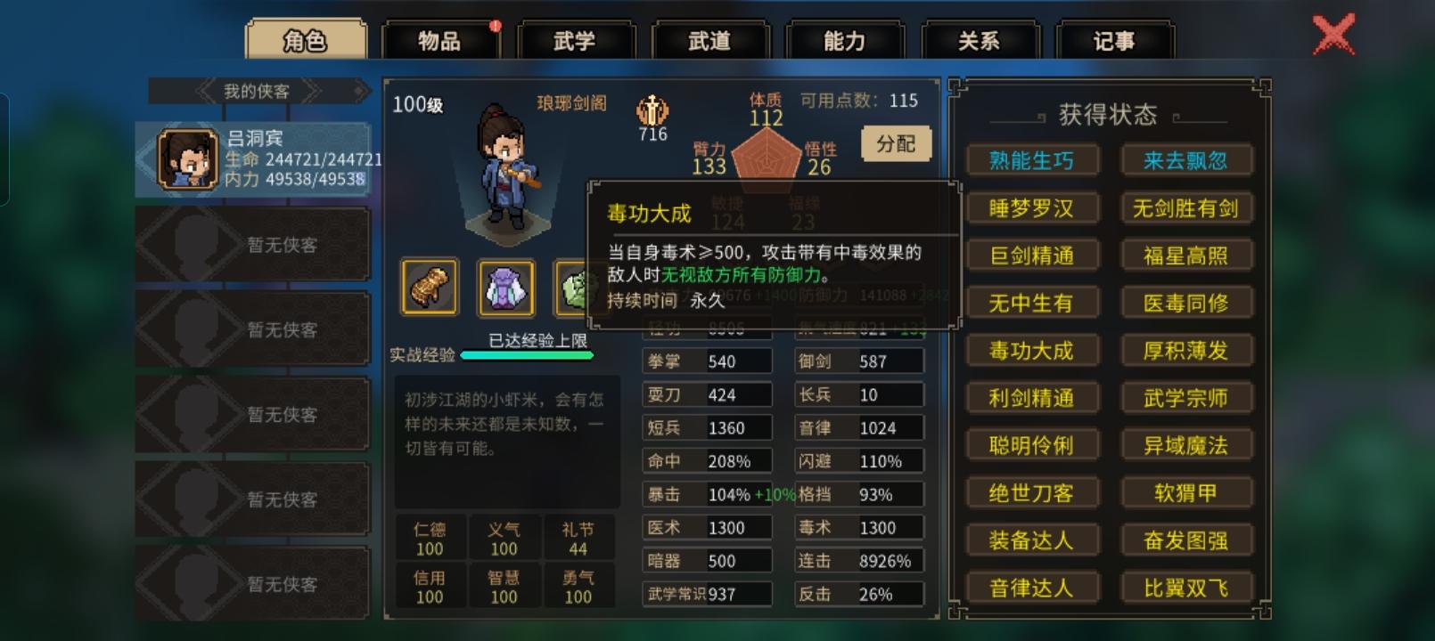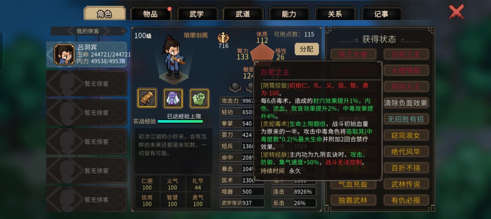 金庸特征白陀之主(攻击中毒单位禁疗,防复活)+金庸特征左右协力(一回合无条件行动2次,第一次上中毒和破一次免伤)+随缘特征毒攻大成(攻击中毒单位无视防御)+随缘内功蛤蟆神功(无视中毒免疫上满中毒)+金庸绝招剑魔九式(破防打百分百生命上限伤害)=无敌秒杀一切(100体力加武道山的减伤天赋也能秒)