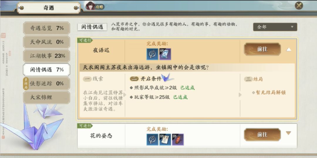 天涯世界除了恩怨争夺的杀伐之外,还有无尽的奇妙的经历和机遇,或许大家都听过来自端游的一首歌曲:金风玉露·夜语迟,今天我们就一起来探索这位可爱少女苏语迟背后的故事。此次内容的奇遇为夜语迟,属于江湖偶遇类。首先激活这个奇遇需要我们在江南主线见过蓝铮与苏小白后前往钱塘集市驿站,对话车夫即可。