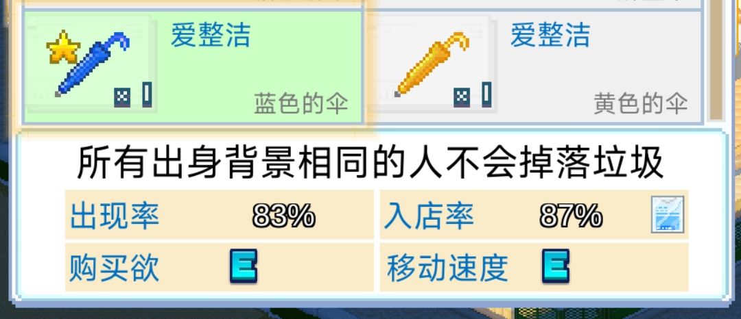 没升到满级时,伞只能让装备它的同名顾客不扔垃圾,但满级伞就不一样了,一把满级伞,就可以让一个地区的所有顾客不扔垃圾。