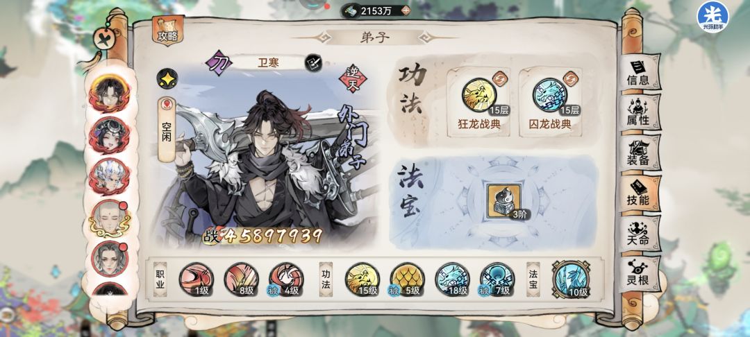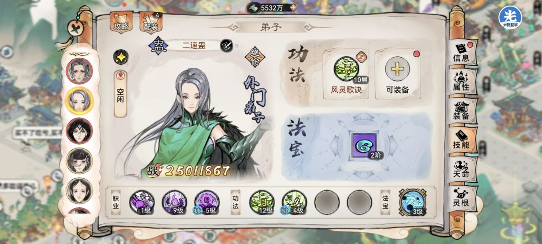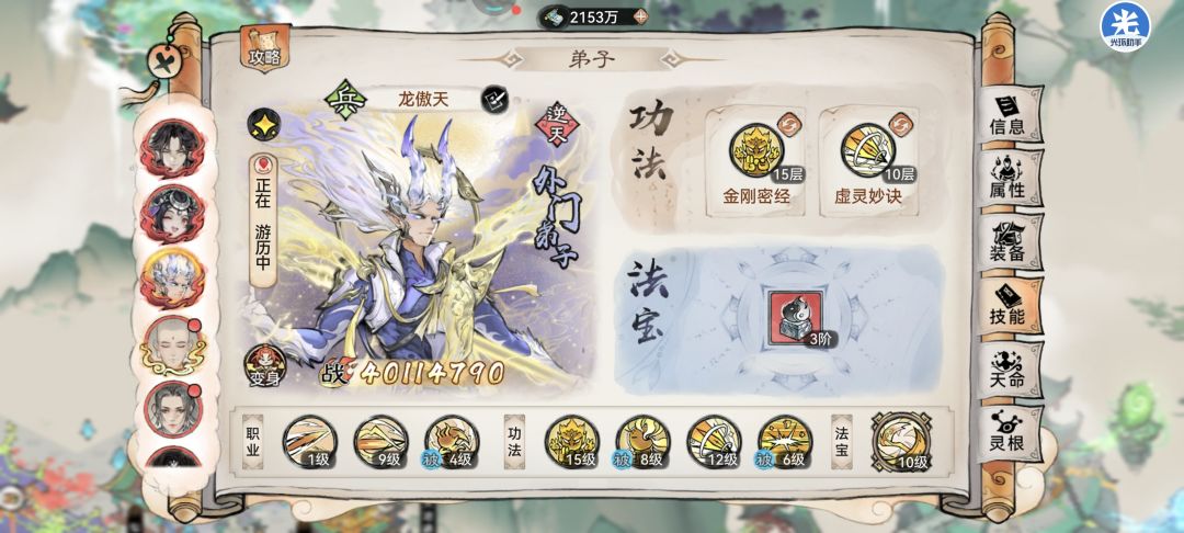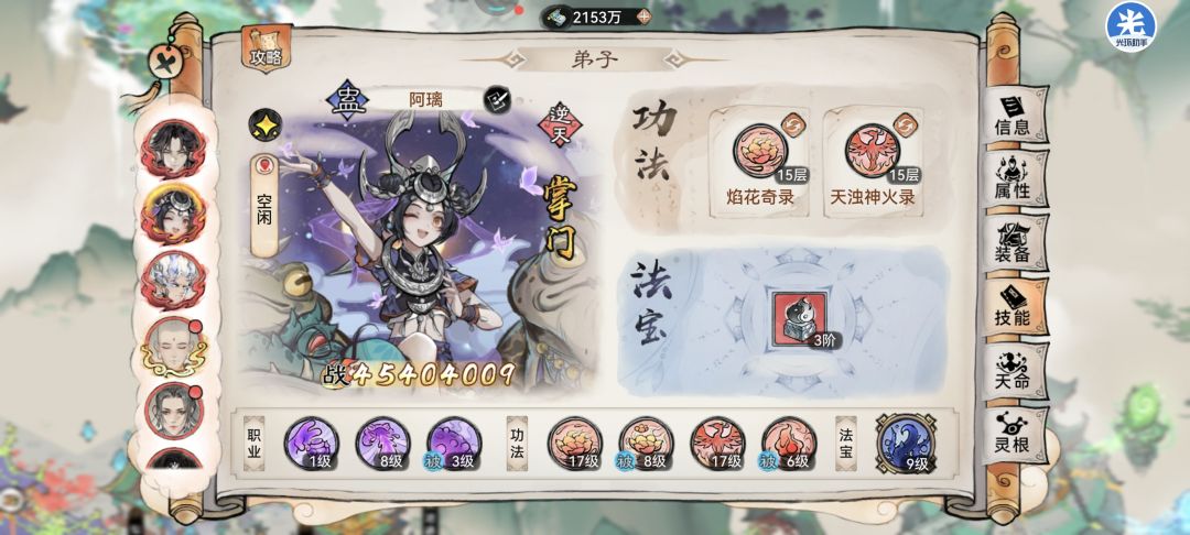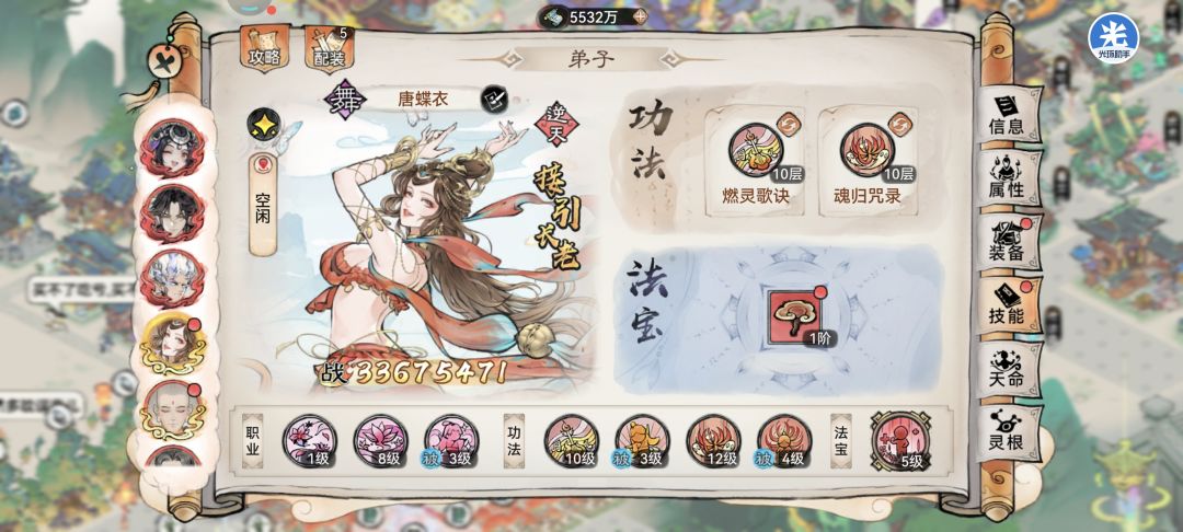 如下所示,还是上面的阵容,只换弟子技能跟唐法宝,战力1.96亿用这套从3300打到3400层没换过技能~![[表情_坏笑]](https://img.tapimg.com/market/images/c0a1dad46508c96c7e68d437a6bbce01.png)