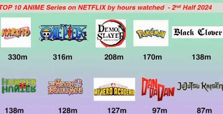 《火影忍者》以3.3亿小时夺冠!全球的火影迷还真是多!收入也达到了惊人的20.7亿美元。