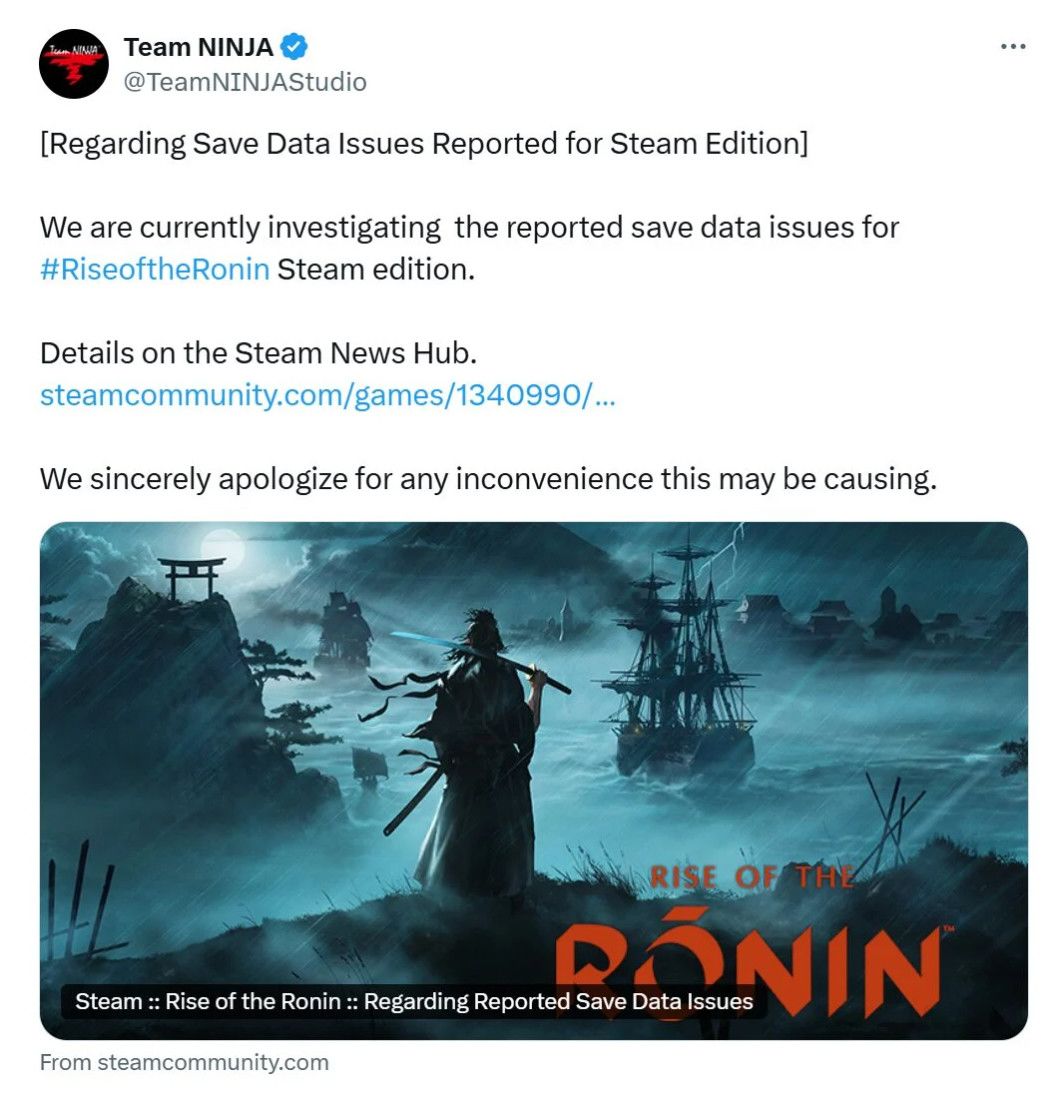 对此,Team Ninja官方X账号发布了消息,称正在调查《浪人崛起》PC
