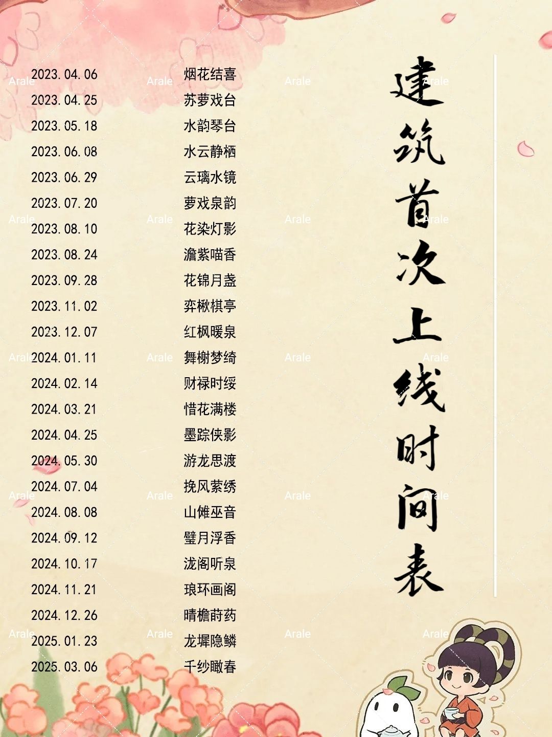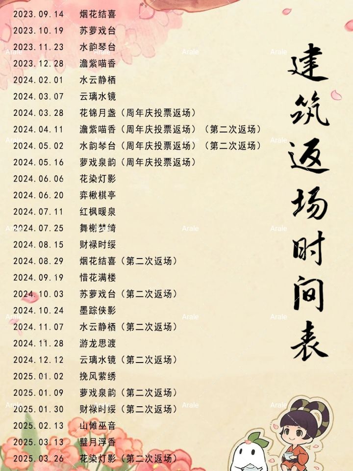 整理了一下桃源已经返场的建筑时间和顺序,和建筑首次出场顺序对比下来,除了周年庆投票返场,其余基本是按照建筑首次出场顺序来进行返场的。按照顺位下期返场建筑:泷阁听泉+澹紫喵香,不过具体的还是按照官方发布的为准。