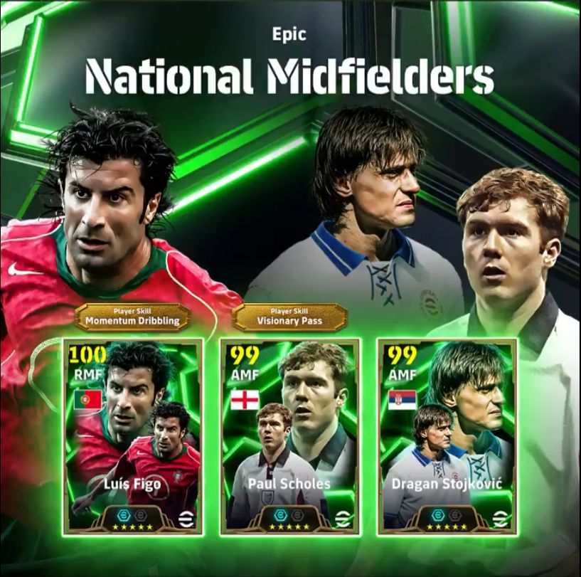 实况足球国际服最新史诗卡包已上架,传奇球员路易斯·菲戈 、保罗·斯科尔斯、德拉甘·斯托伊科维奇已准备好加入你的11人队伍。