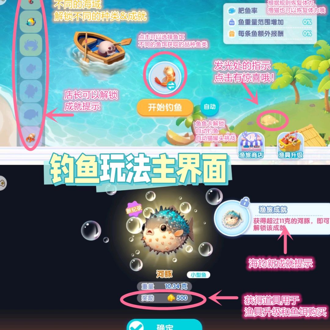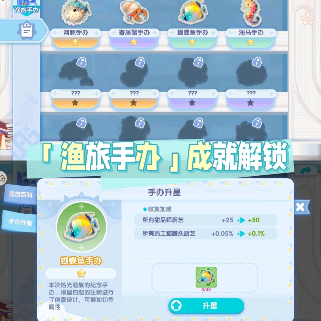✨旅渔手办:店长的收藏解展示,根据钓鱼的重量解锁不同的成就,手办升级可以获得主店员工和猫罐头的厨艺加成;猫罐头厨艺用于猫罐头挑战。