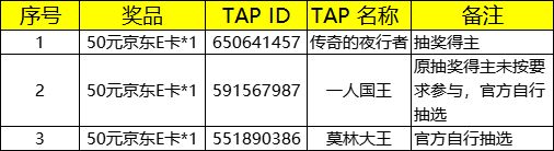 1️⃣ 运气之子(2名):50元京东E卡*1 ,由tap平台抽奖工具选出