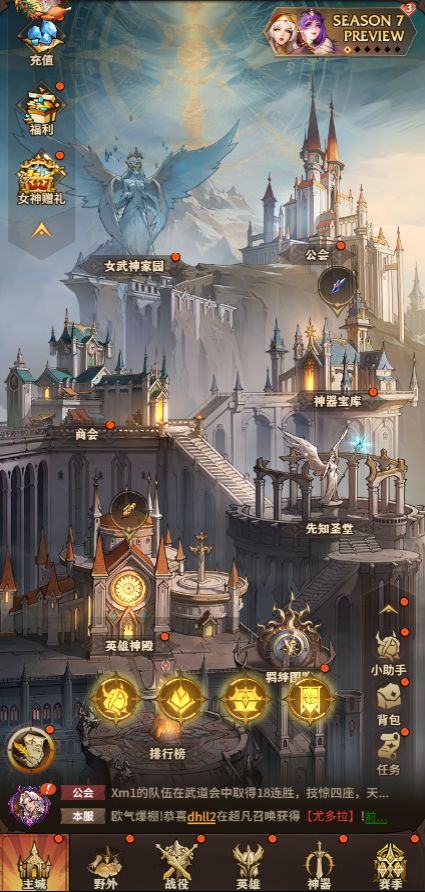 女武神家园、公会、神器宝库、商会、先知圣堂、英雄神殿、羁绊图鉴和排行榜。