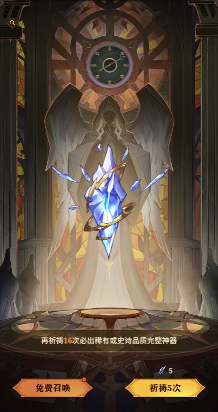 这里是抽取传说神器的区域。建议在至少能进行 100 次召唤时才去抽取,以获得 30 个传奇神器碎片作为奖励、