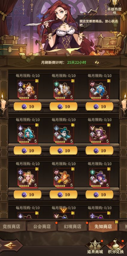 购买各种资源的地方。避免在这里乱花钻石。 建议购买七折以上的物品。请务必定期查看积分兑换模块,尤其是先知商店中的神魔角色(根据角色等级列表选择)。