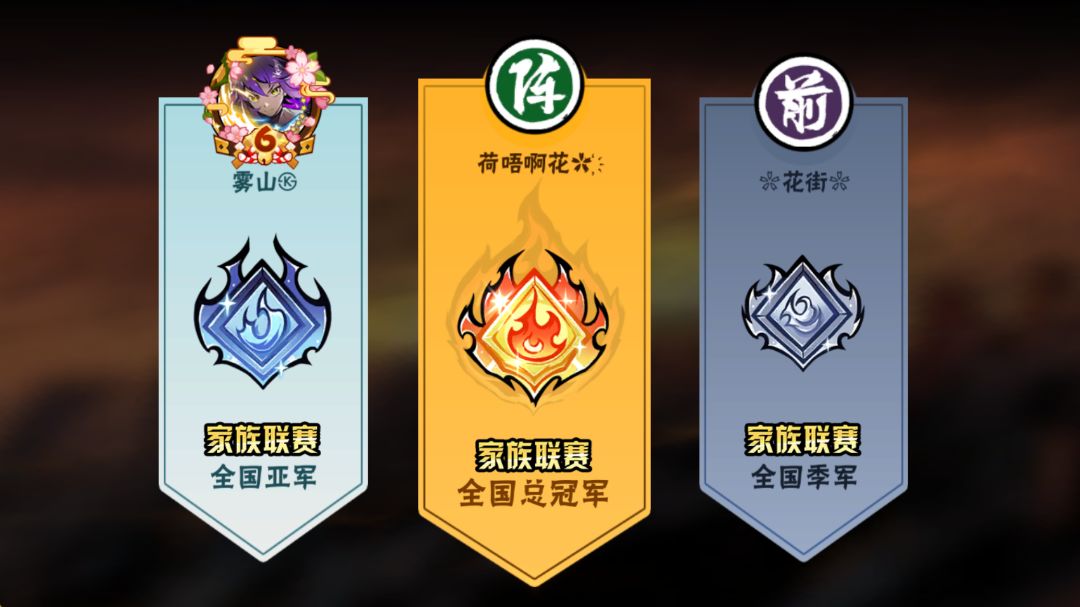 历经风雨,破水而出,荷花初绽,坚定不凡!一路过关斩将,摘得联赛桂冠,恭喜【荷唔啊花】家族巅峰加冕,获得本届联赛全国总冠军荣誉!另外两大家族也以强者之姿登上本届联赛荣誉榜,恭喜【雾山K】家族获得本届家族联赛亚军,恭喜【花街】家族获得本届家族联赛季军!‘