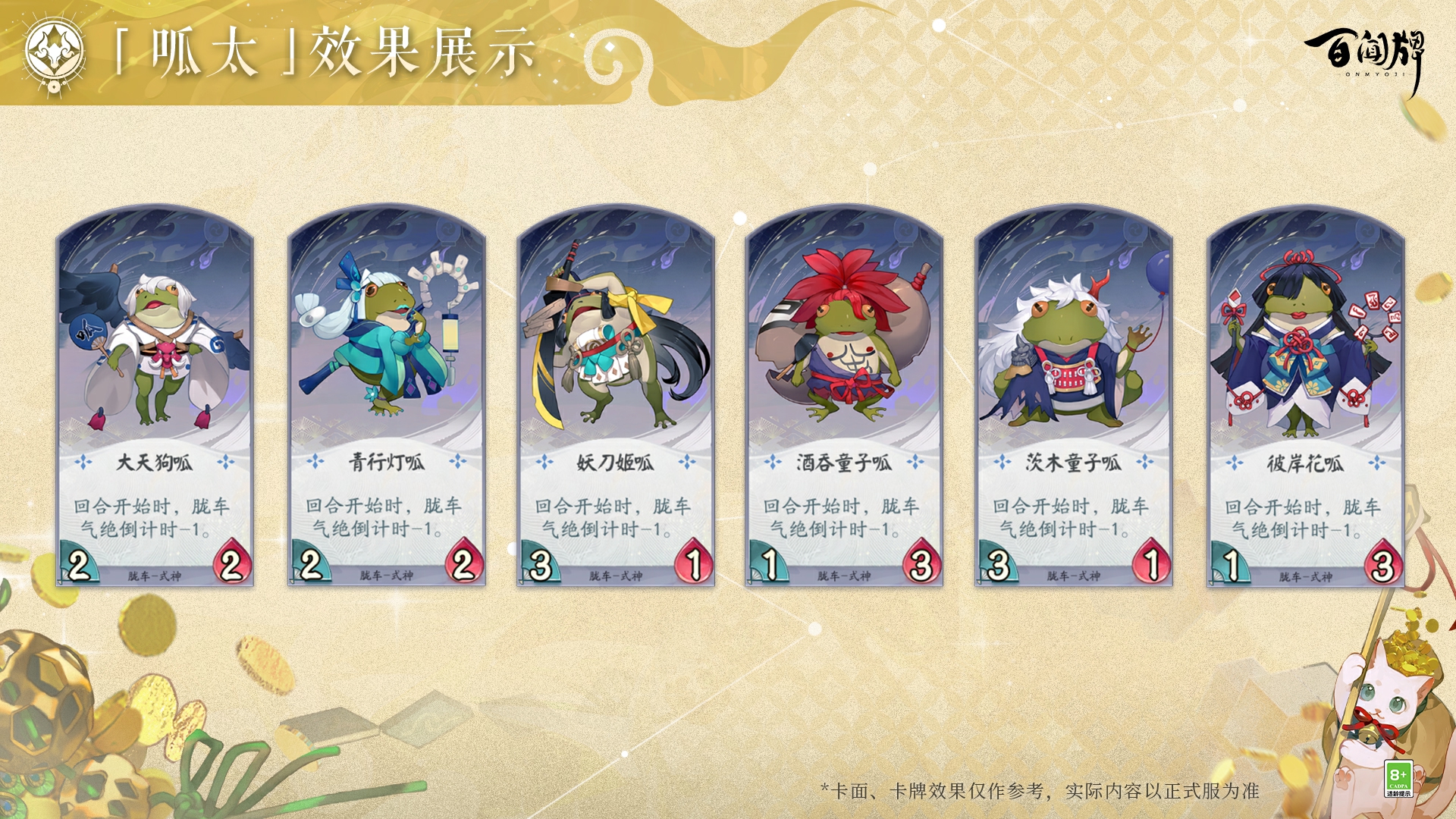 胧车每次受到伤害时都会随机召唤呱太。胧车的卡牌能力可以强化呱太的属性,或者让呱太使用专属卡牌。 更多式神与卡牌情报奉上↓↓(卡牌效果以正式服版本为准)