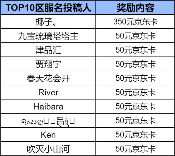 TOP1人气区服名投稿人额外获得300元京东卡奖励!