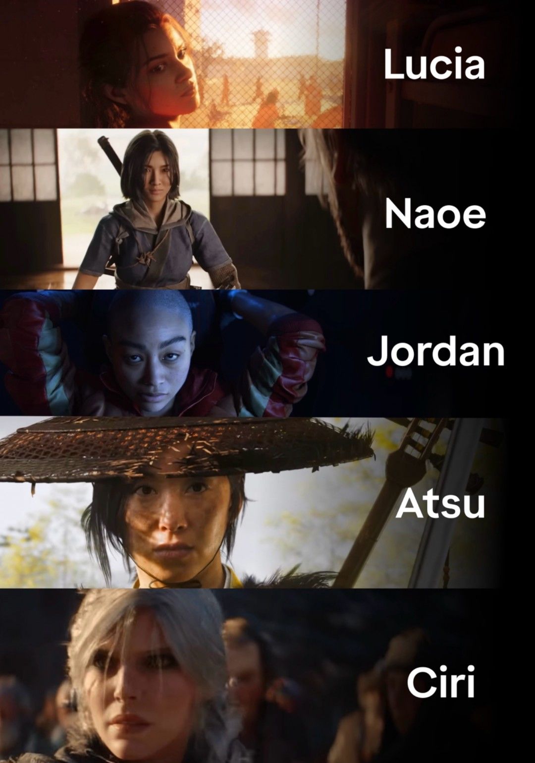 比如,《GTA6》有女性主角Lucia,《刺客信条:影》有奈绪江,顽皮狗的《星际:异端先知》有Jordan,《羊蹄山之鬼》有Atsu,《巫师4》有希里。