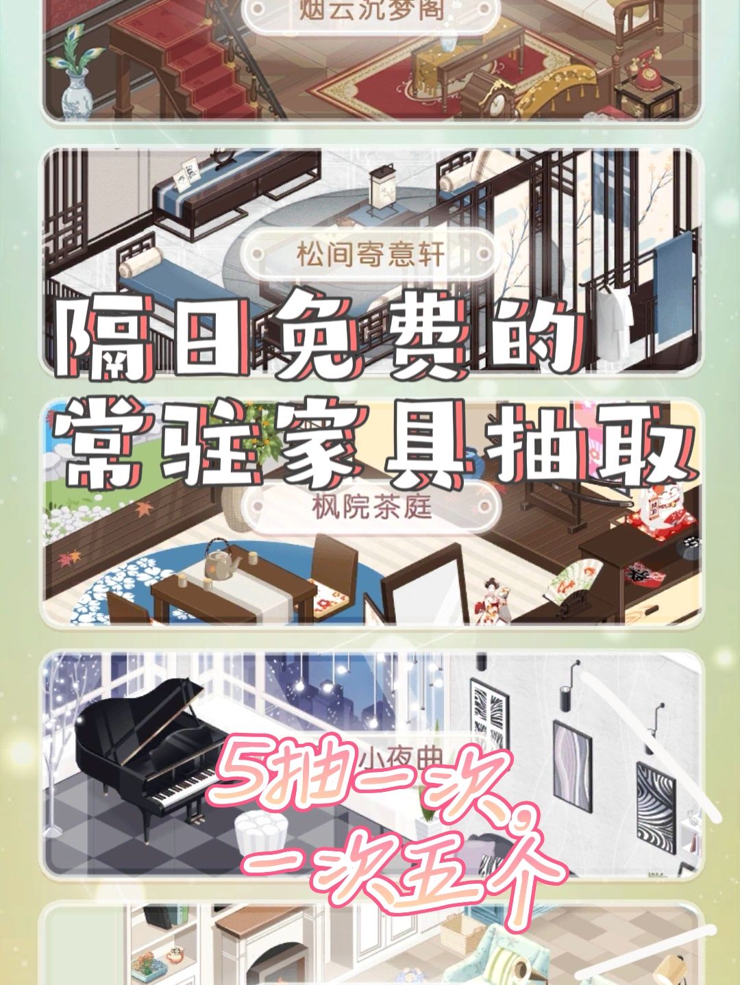 - 复刻活动或上新家具常推出限定家具,同样可以隔日获取免费一次,也可以钻石抽取。