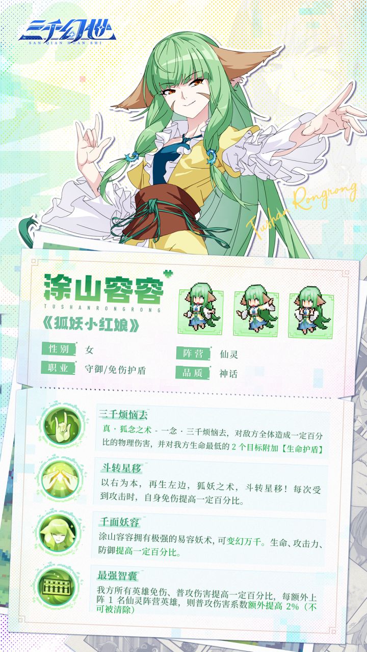 涂山容容拥有极强的易容妖术,可变幻万千。生命、攻击力防御提高一定百分比。