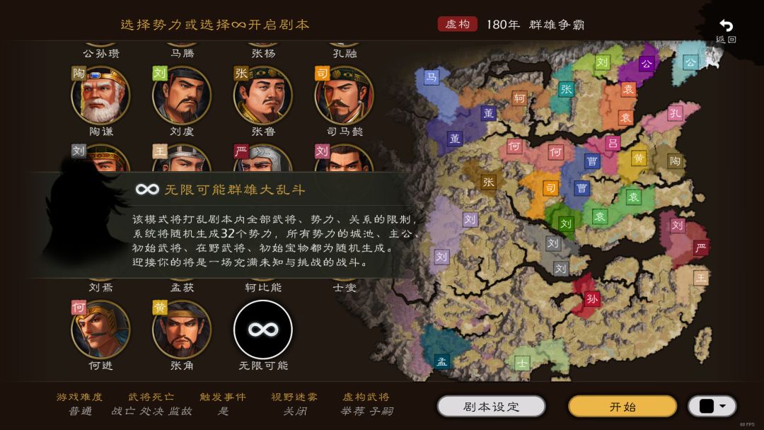 1、「群雄逐鹿」剧本中增加“无限可能”模式,该模式将打乱剧本内全部武将、势力、关系的限制,系统将随机生成32个势力,所有势力的城池、主公、初始武将、在野武将、初始宝物都为随机生成。迎接你的将是一场充满未知与挑战的战斗。