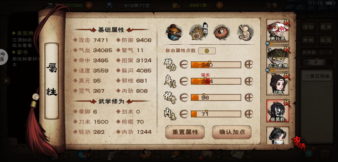 其次,通关阵容是月剑、商刀、僧棍,主合道选的至阳(3朱雀3青龙),大星云精进10破招5连击(招架太猛了),随从免伤(不算秘技):僧27.8,月17,商19.7。最后打完诸葛长空的无buff属性如下: