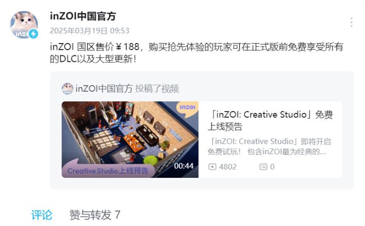 今晨9点,《inZOI》线上发布会举行,官方在会上正式揭晓游戏售价,国区定价为¥188 。游戏将于北京时间3月28日上午8点以抢先体验版的形式正式发售。值得一提的是,购买抢先体验版的玩家,在正式版推出前,可免费畅享所有DLC及大型更新。