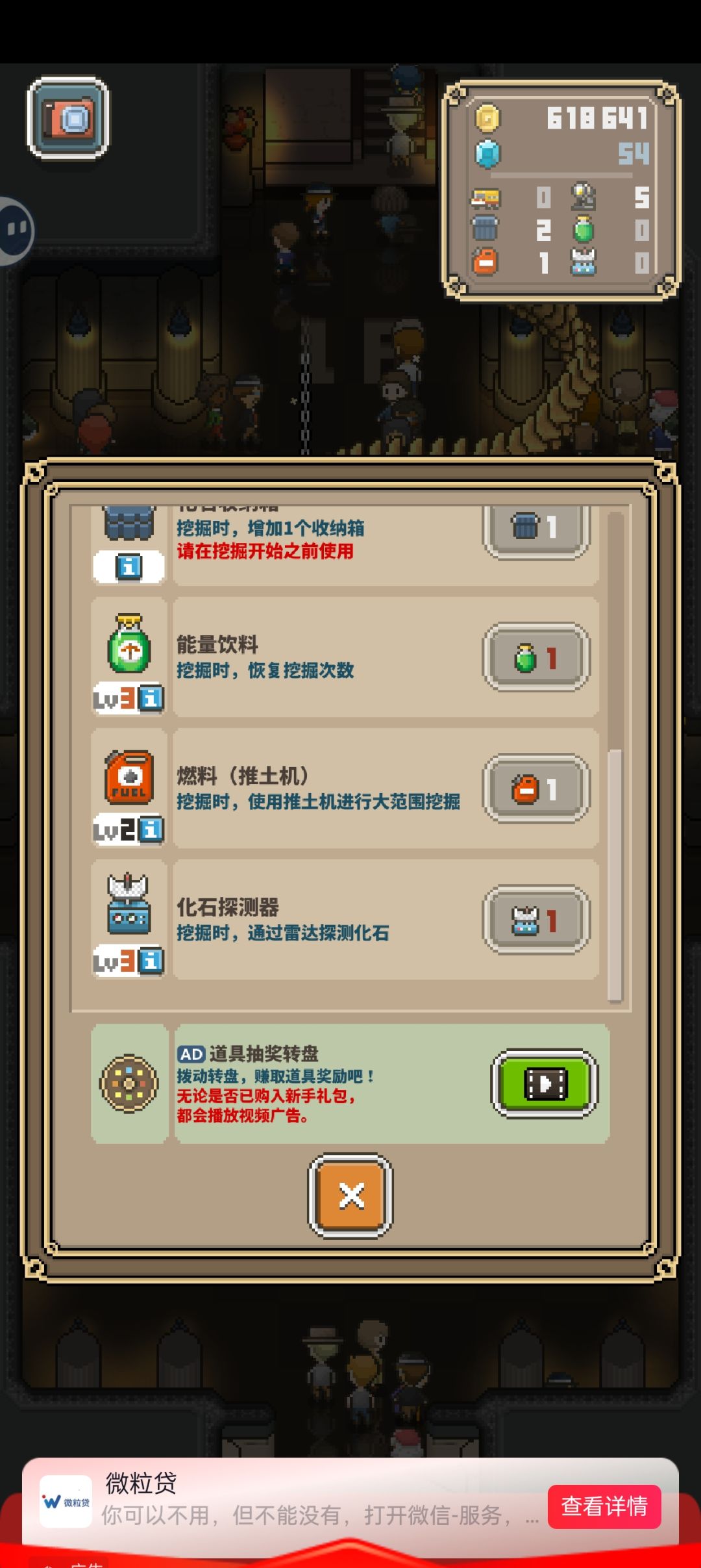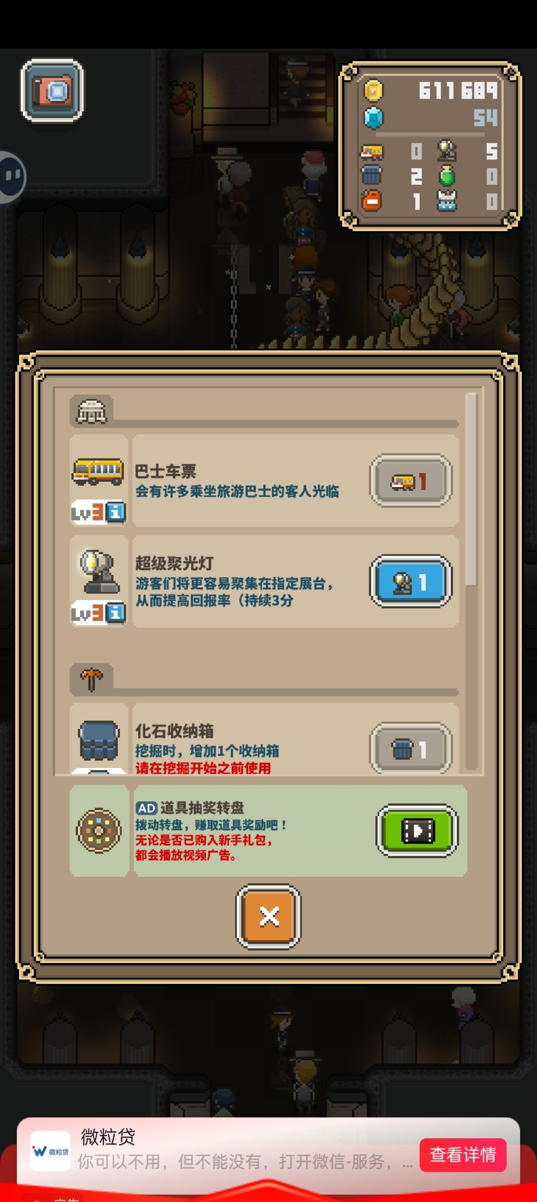 道具主要是1分钟看广告开公交车,其他没太大用,每12小时可以看广告全开,挖难度大的恐龙用,一小时看一次广告,嫌麻烦可以不看,钻石刷200的时候长的很快