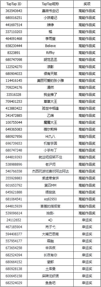 2.获奖名单将在活动结束后20个工作日内,由TapTap游戏獭进行公示;公示期为公示动态发布后的72H内,若有获奖作品存在疑似违规行为的投诉,经主办方核实后,将取消违规作品的获奖资格