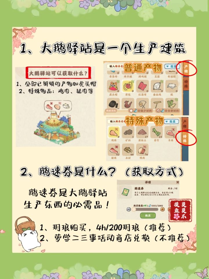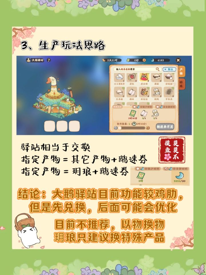 🍃核心玩法:就是消耗其他产物+鹅速券生产你想要的物品,不同物品需要的东西不一样。也可选择玥琅代替物品,只消耗玥琅+鹅速券鹅速券推荐玥琅兑换,活动币较为珍贵。不推荐!!