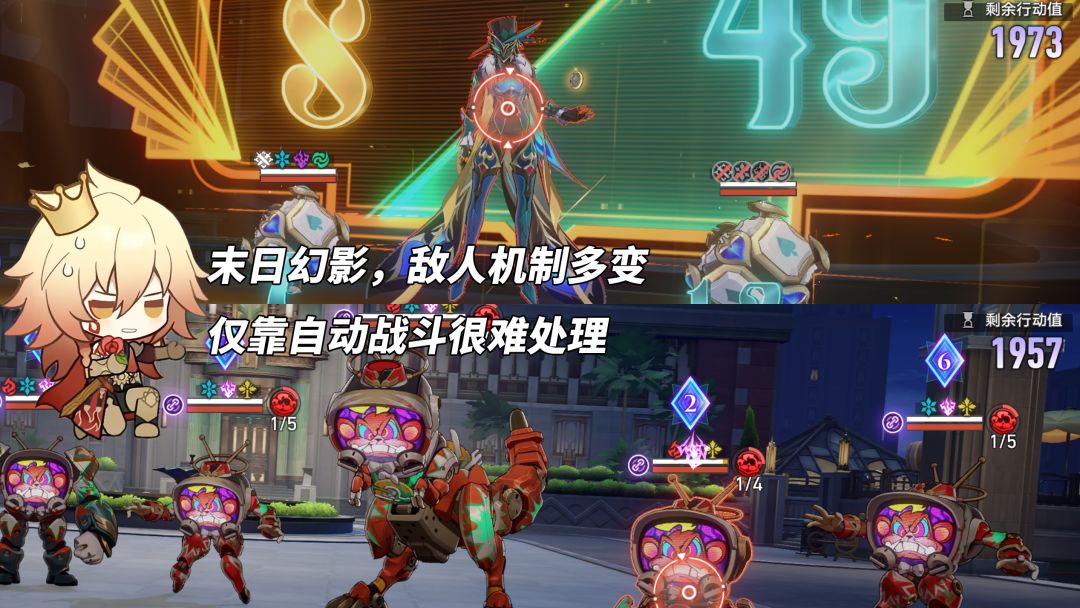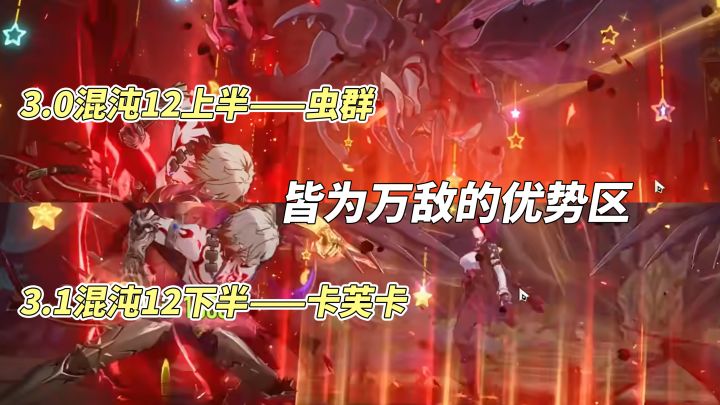 诡奕砂金,顺序消灭骰子;蕉言组,各成员需受到一定攻击次数才能转化为增益状态;卡芙卡,优先击破两侧小弟;神主日,队伍削韧强度要求高。