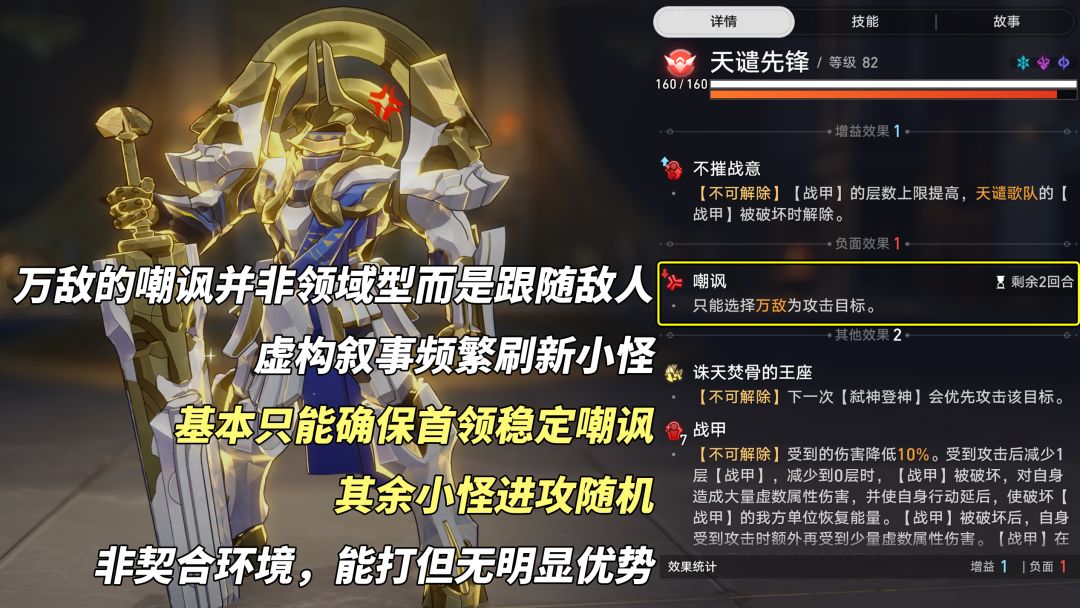 万敌能打,但不擅长。全局下来嘲讽能够稳定挂首领身上,但小怪进攻就基本随缘,想玩三拐一无生存位,虚构环境队友压力稍大,万敌自身倒是能抗住。