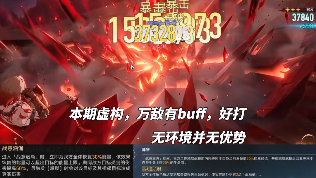 最新一期虚构叙事,爆裂buff清第1+第2波次小怪、配合战意汹涌回能30%、配队buff战技扣血20%当前+回血20%上限,也算是万敌舒适区了,挂机分数也可打3W+。
