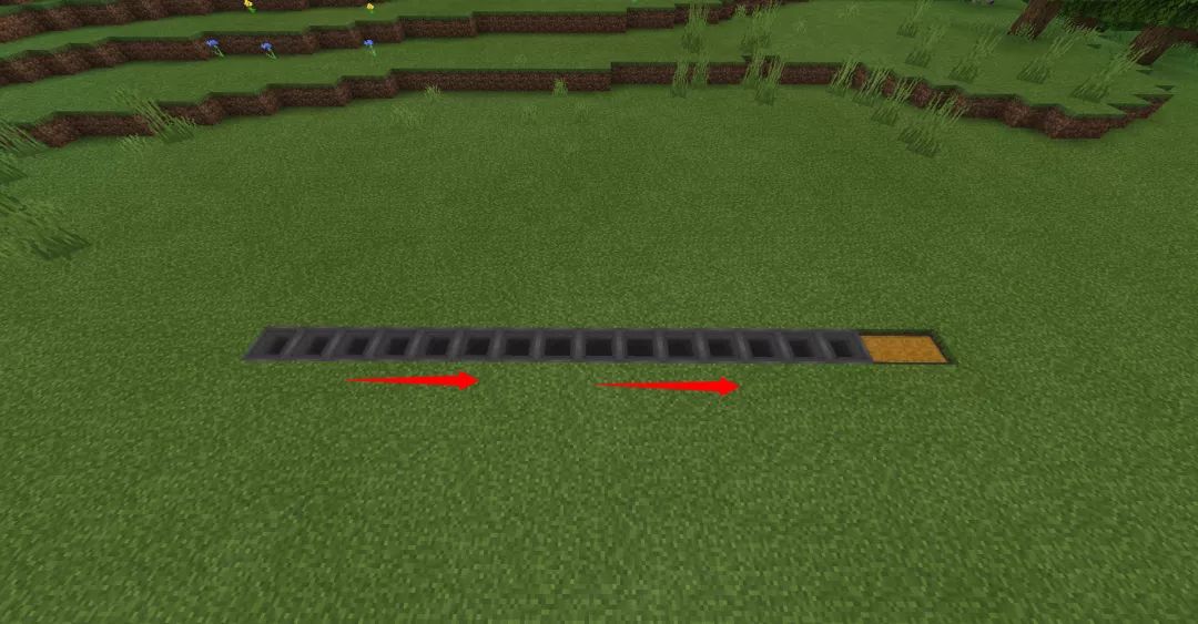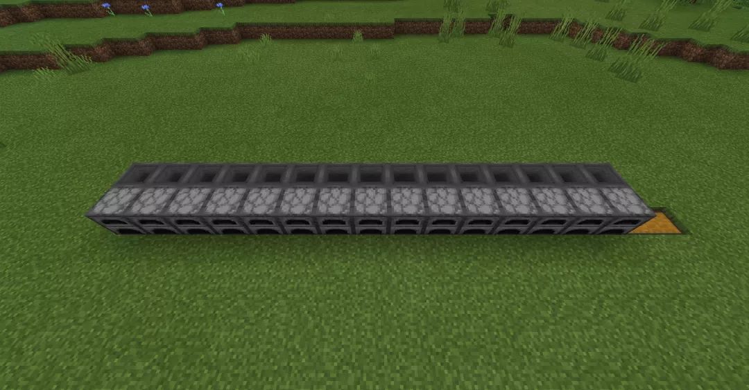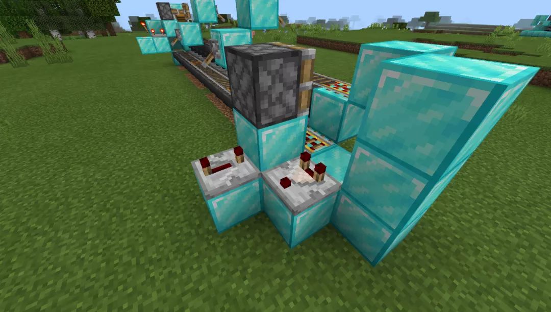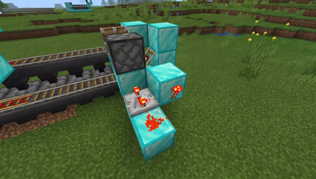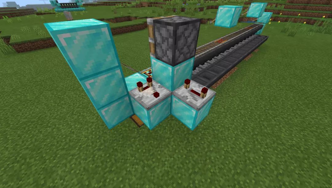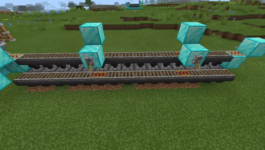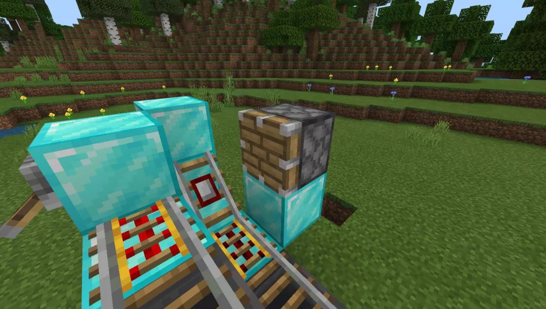 回到探测铁轨的一侧,在动力铁轨的后方放置一个普通方块和活塞,并如图放置红石比较器和一个满档的红石中继器