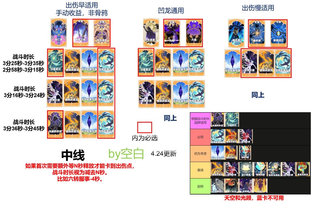 如果带了加冷却的光顾的手段(冷却+10),绑定核间花园。3分钟以上的晦芒绑定世界之夜,其他组合根据品质星级选备选。不过四分外多一点的场景基本没有,再长就不考虑带光顾了。