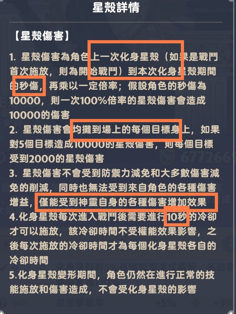 所谓小部分的伤害减免,指的是特定副本boss的减伤效果。换句话说,星壳伤害只是简单的对前一段的秒伤的秒伤进行计算,不用考虑放的时候自身是什么buff状态,也不额外吃觉醒和暴巧效果。