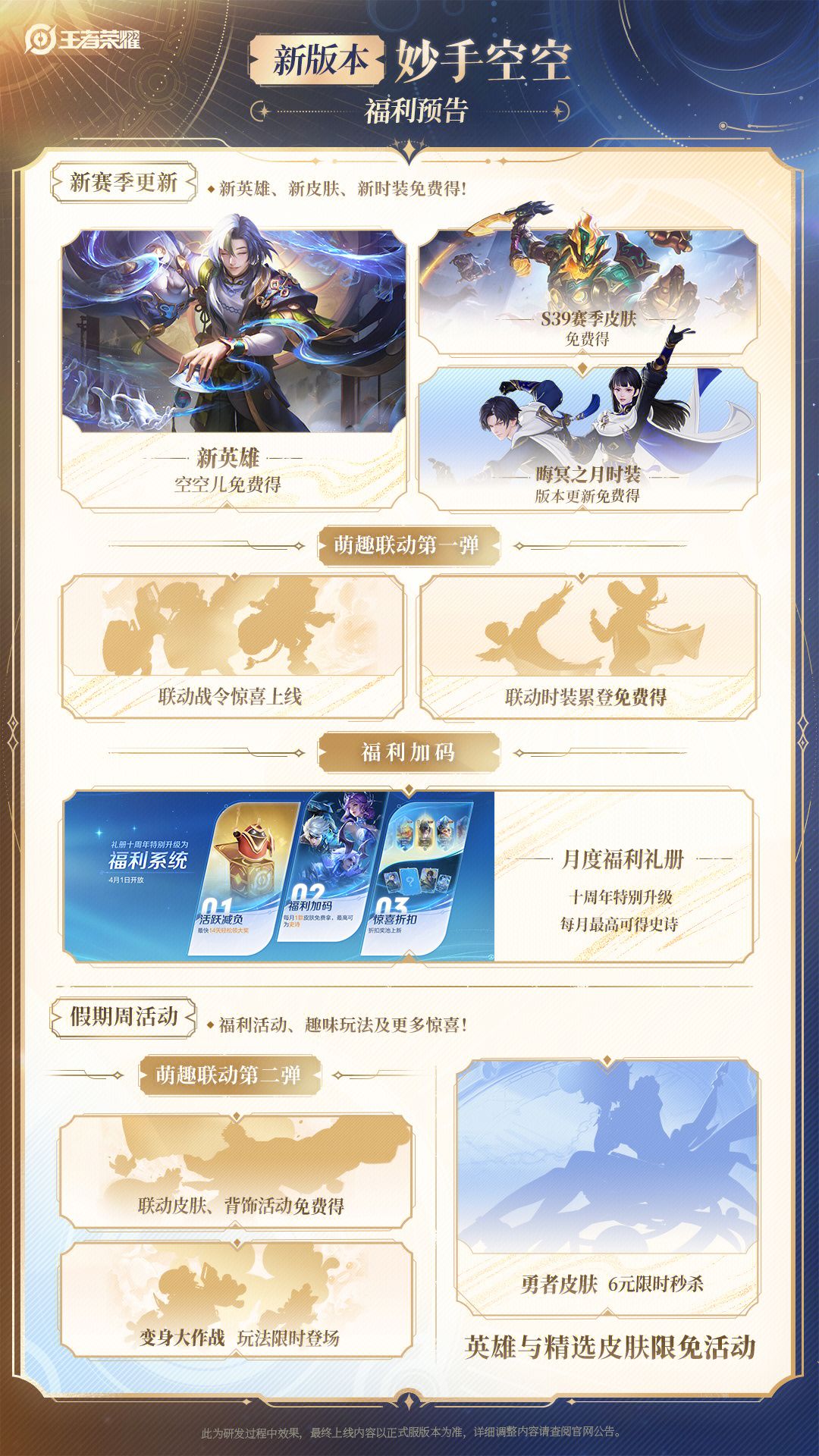 【福利加码】回忆礼册特别升级,每月1款皮肤免费拿,最高可得史诗还有联动战令惊喜上线、【变身大作战】玩法限时登场,以及勇者皮肤限时秒杀等即将来袭,敬请期待!