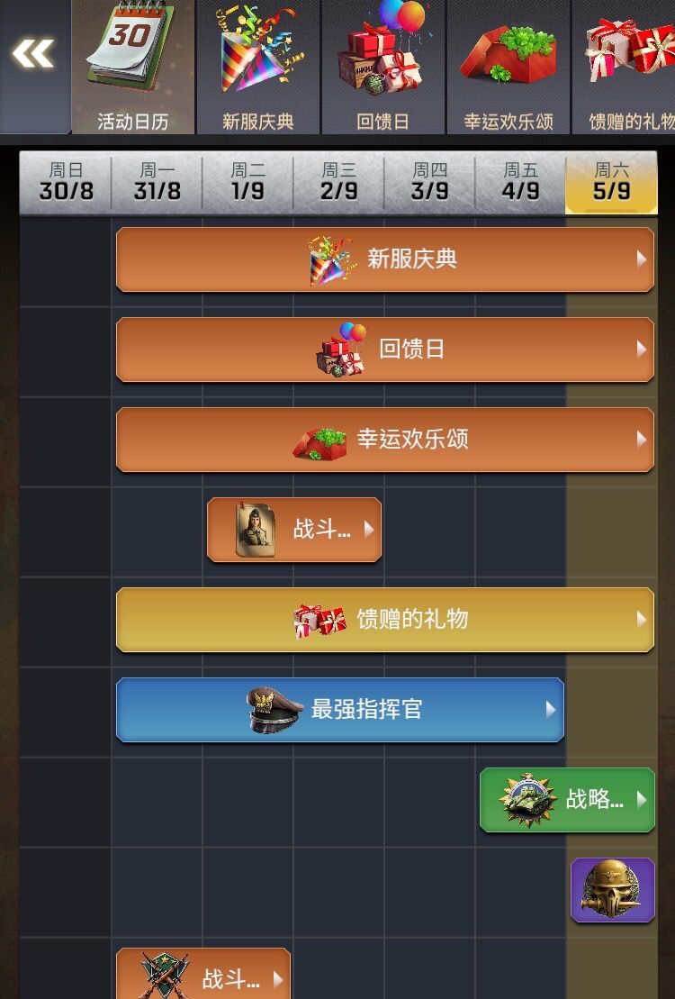 点开页面活动首位就是活动日历,指挥官们可以通过日历查看到最近七天的所有活动简介、奖励、与起止时间(注意很多活动都是设置最后一天无法完成任务的,只能领取前几日已完成的任务奖励,需仔细阅读简介)