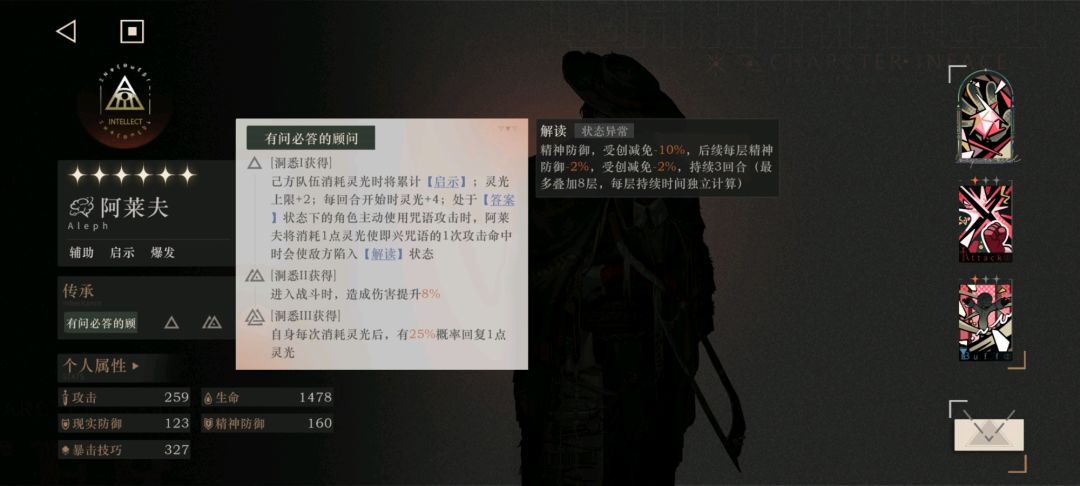 若将阿莱夫作为通拐,每个敌人能叠 3 层解读已属不错。至于答案,即使给予阿莱夫足够的牌权让其每回合放 buff,也只能获得 16%精神减防、16%创伤加成和 40%术法威力,算上心相常驻的 6%创伤加成,以及假设 8 回合叠满威力平均下来每回合多 6%威力加成,这样的收益与所消耗的大量牌权和长时间的暖机过程相比,性价比极低,远不如阿尔古斯半挂机的效果。