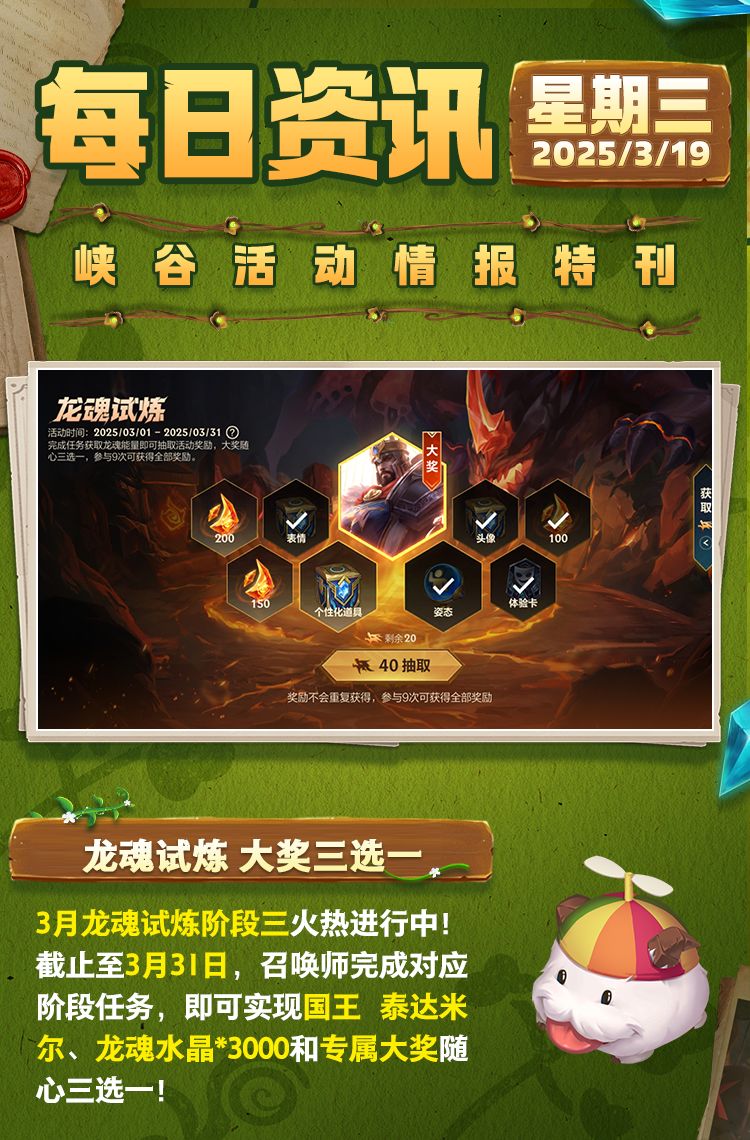 娱乐模式赛季调整,一起冲击“终章奖励”!截止至3月28日,召唤师完成大乱斗或双人竞技场累计10场对局,即可领取深渊之骰*5与龙魂水晶*200奖励~