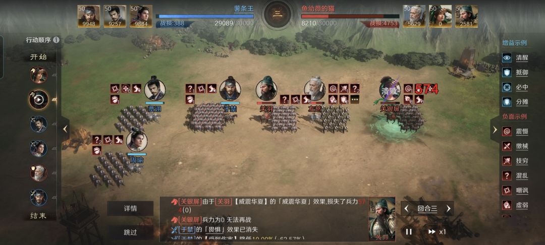 然而本文献上的战报颇为倒反天罡,于禁不仅打赢了关羽,而且胜得干净利落。特别鸣谢游戏ID名为“薯条王”的朋友,给本文提供了宝贵的创作素材。他利用于禁、贾诩和周瑜摆出箕形阵,三个回合之内就让对面的双关左组合陷入了崩溃。而且关银屏还是被关羽亲手打废的,这里面的算计如何,我都给整理到了下文的段落之中。