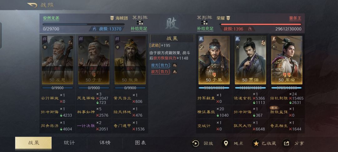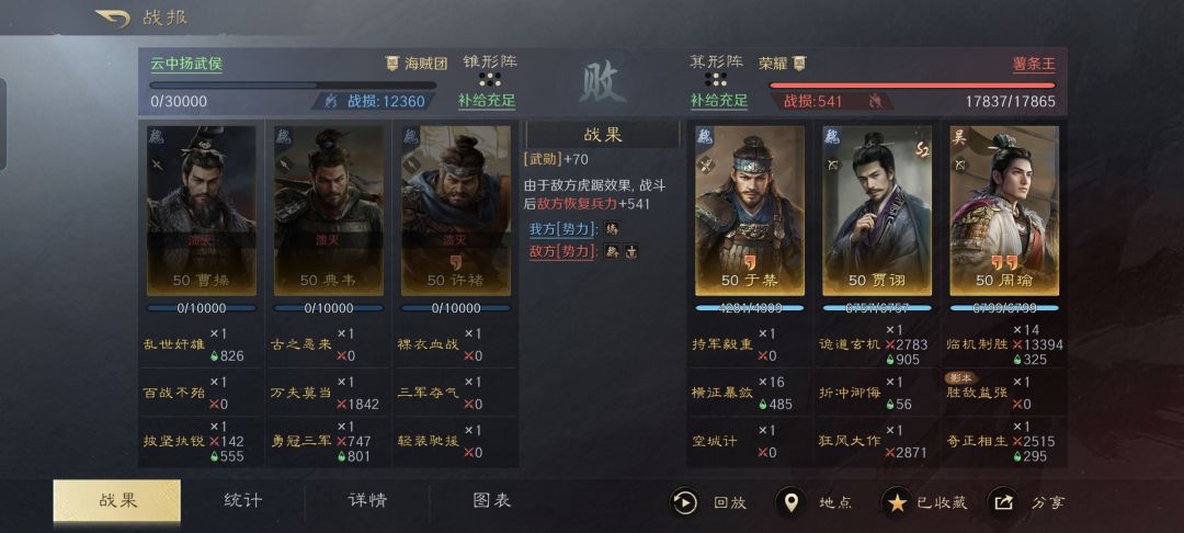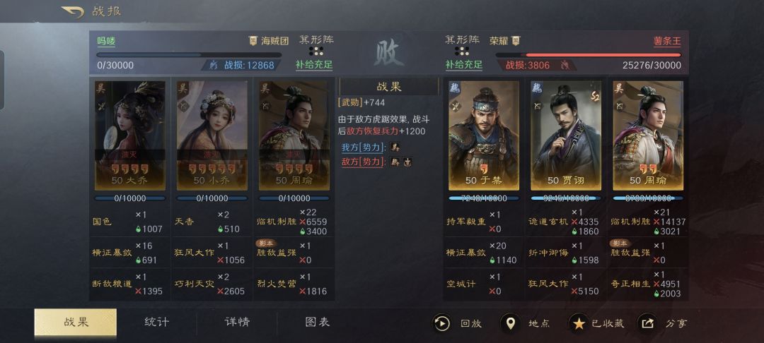 虽然这支队伍能够对手施加的异常状态不多,只有缴械、混乱和风暴,不过贾诩和周瑜打配合确实是相当的恶心。对面的双关左,被这一套组合拳弄得全程都是混乱互砍,可让于禁痛痛快快的一雪前耻啊!