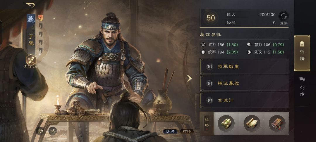 于禁战法:持军毅重+横征暴敛+空城计。韬略库:持军(专属)+兵令善本+互势善本。高级兵种:无当飞军点亮声东击西。