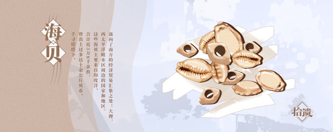 千寻塔塔下,曾出土过多达十余公斤贝币,合计近3万8千余枚。这些海贝主要来自印度洋、西太平洋暖水区的周边国家、地区。这些大部分沿岸区域所使用的海贝,流向了南方的经济贸易汇集之处:大理。这十余公斤的贝币,对翼如来说并没有什么意义。早就过时的货币,买不了吃也买不了喝,充其量也就是小孩子的玩物了。
