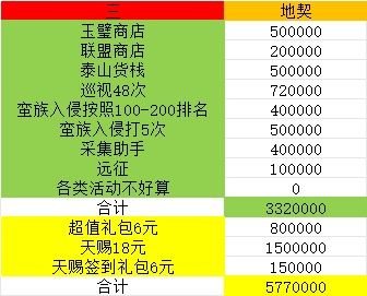 表格红三地契就不多说了,理论上每天按照正常进度,是不会缺的,缺的话检查一下自己的征战打了多少,每天的蛮族入侵有没有用对应的异兽跟国策打(毕方、野猪,穷奇或熊,国策无中生有、策无遗算、士气如虹),地能拿很多,还有观礼,再不行的话可以适当买点演武场的体力丹,如果还缺,那就只能适当氪点自选、天赐礼包,优先度还是天赐签到6>天赐18>超值6>自选6。