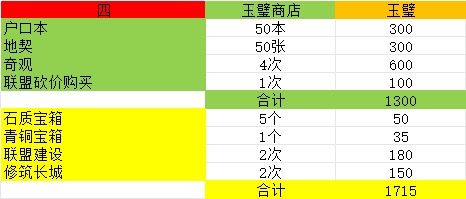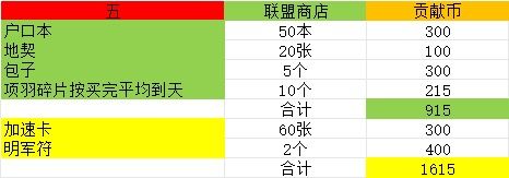 表格红五,0氪绿色全买,活跃联盟完全够,联盟建设免费加广告2次有300贡献币,锤子4个有440,抗击匈奴按照上面说的蛮族把士气如虹换成回天,打个三四百贡献币是低配。微氪玉璧充足的情况下,联盟建设玉璧点两下,锤子玉璧点两下,花费330玉,多420贡献币,能多买两个藏品抽奖或者明君符,比在商店买便宜70玉,斟酌考虑。包子,不多说,整个游戏性价比最高的,每天商店必清,就拿联盟的来说,1个包子60贡献币,算他7个包子打一次远征拿绳子,也就是420,直接买绳子400贡献币,但是多20的贡献币能多300张蓝色加速卡跟两种资源,唯一缺点就是手动了。