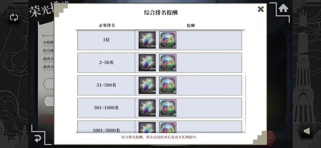 参与荣光挑战,可获得 综合排名报酬 、 小组排名报酬 以及 得分报酬 !