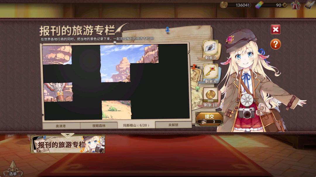 除此之外,这里还有记者·夏洛蒂带来的报社任务。店主可以帮记者收集相片来丰富专栏,获取奖励。相片可通关主线获取,通过数关新的主线即可获得1张,每次提交需要3张。点击提交可以查看当前持有的相片数量。