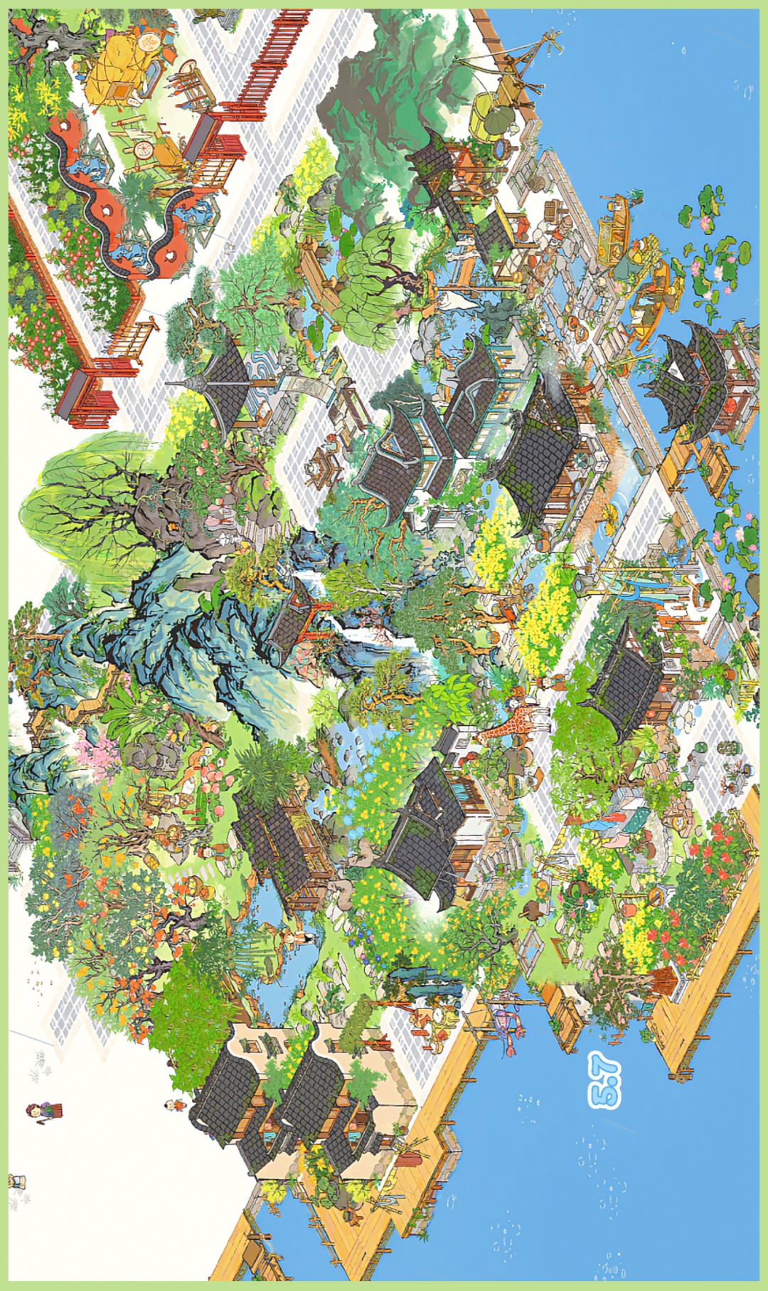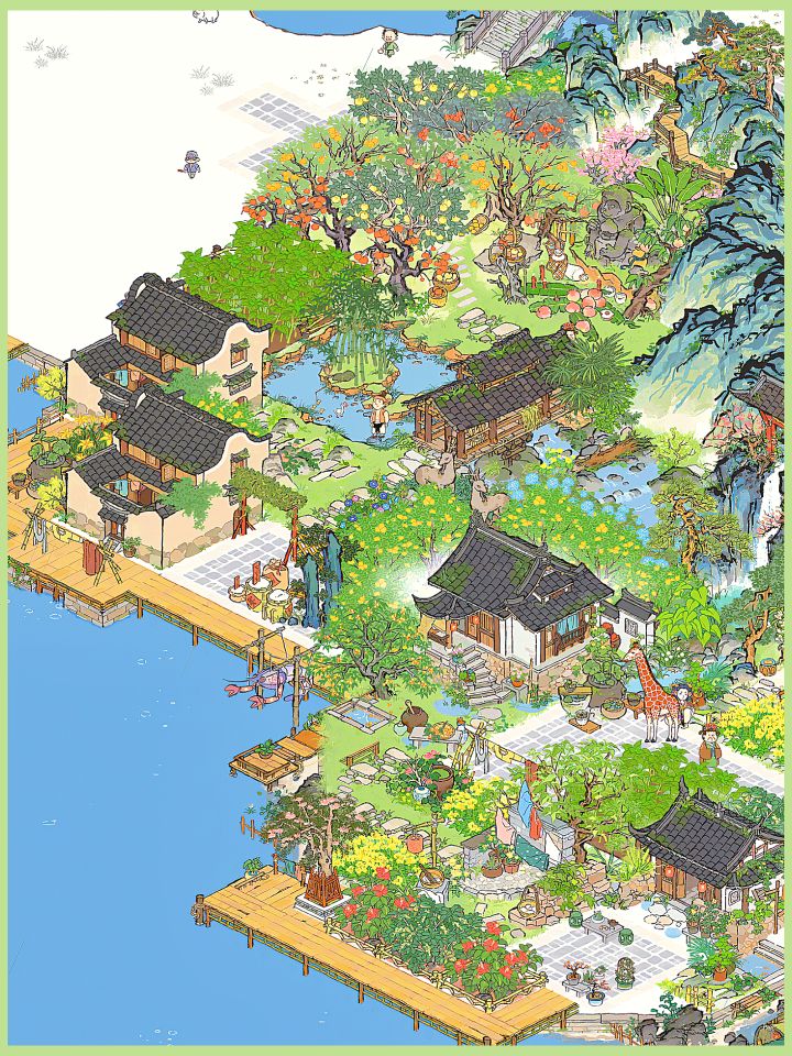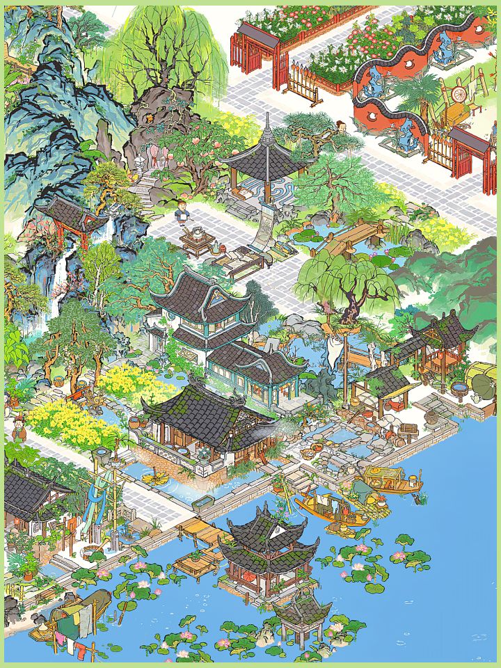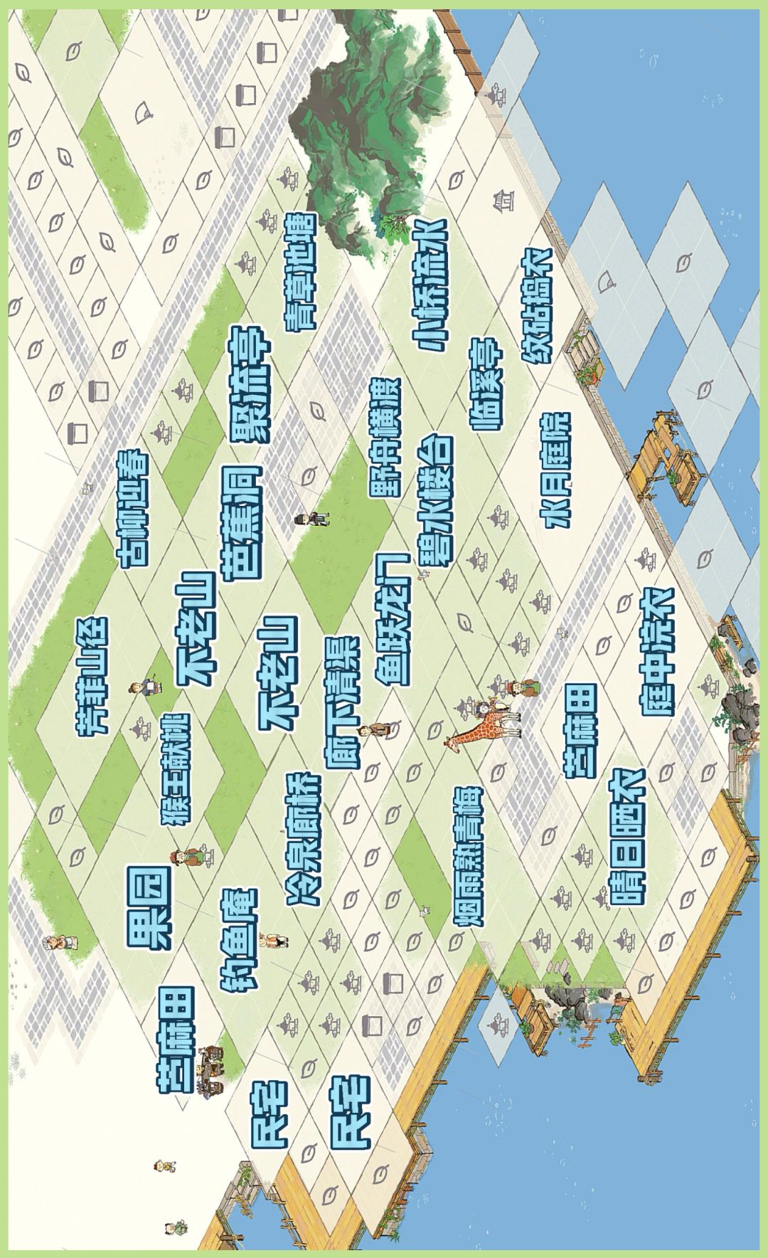 芳菲山径、不老山、果园、猴王献桃、钓鱼庵、冷泉廊桥、廊下清渠、鱼跃龙门、碧水楼台、临溪亭、水月庭院、野舟横渡、小桥流水、水月庭院、树荫亭、半亩油菜、池芳亭、连家渔船、烟雨熟青梅、晴日晒衣、苎麻田、庭中浣衣、5级民宅、芭蕉洞、聚流亭、青草池塘、古柳迎春、