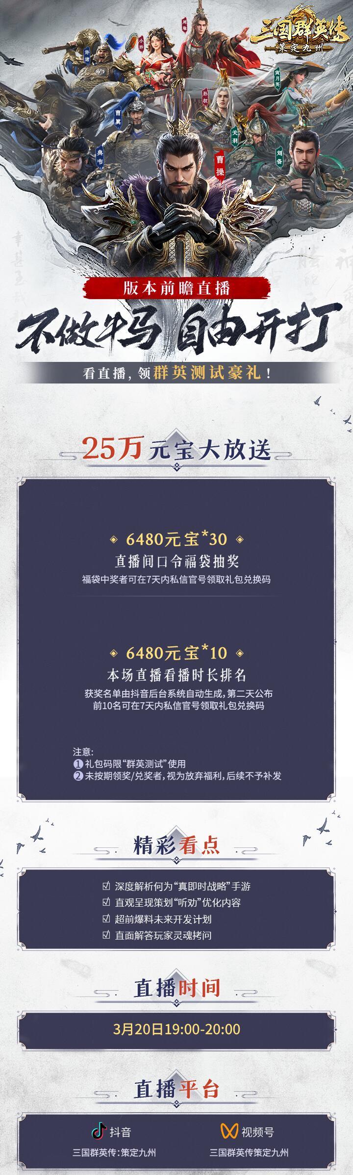本次直播将揭晓全新版本核心玩法,更有海量福利现场派发,诚邀各位主公共襄盛举!3月20日晚7点,我们直播间不见不散!