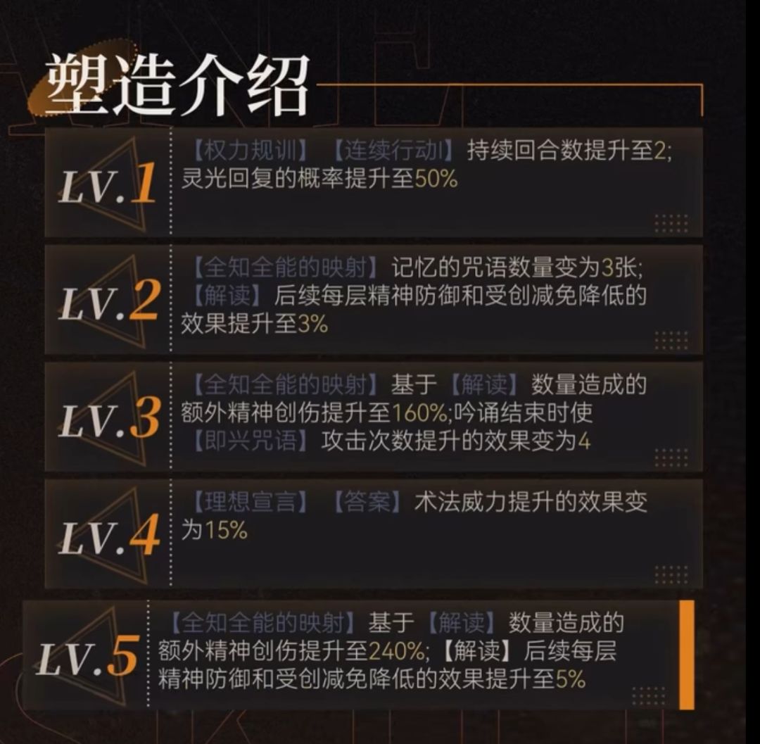 3. 3塑:提升小于10%,仅在爆发回合有一定作用,可提升640%仪式额外倍率以及获得2次即兴咒语。