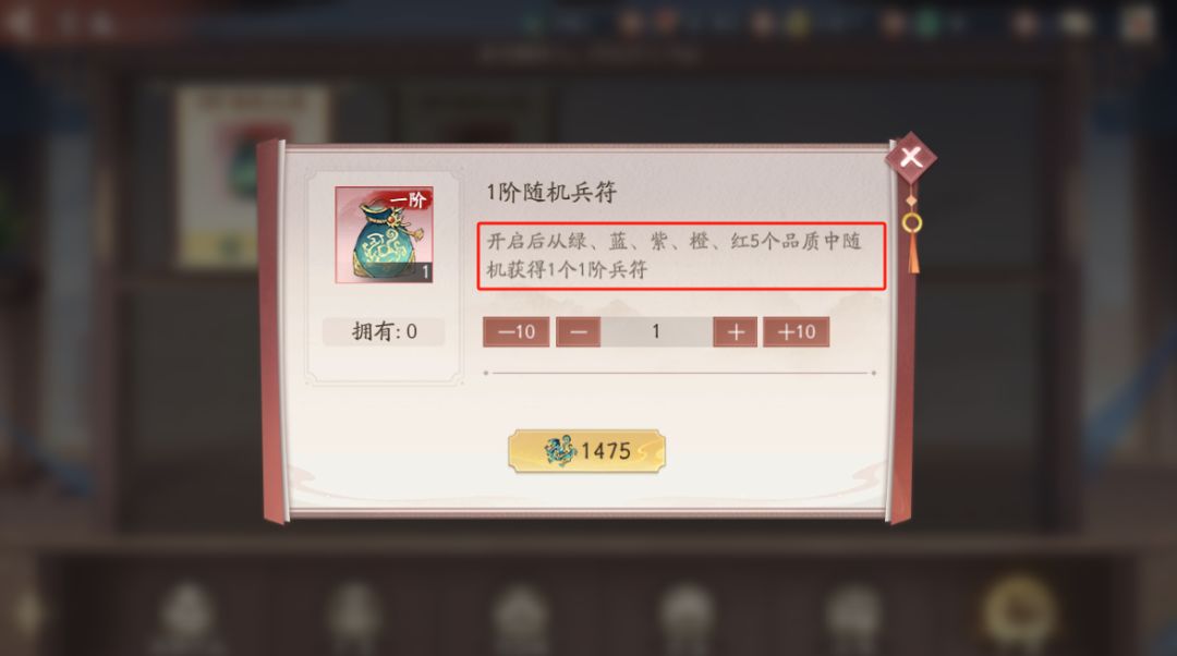 消耗兵令*1475可获得一阶随机兵符*1